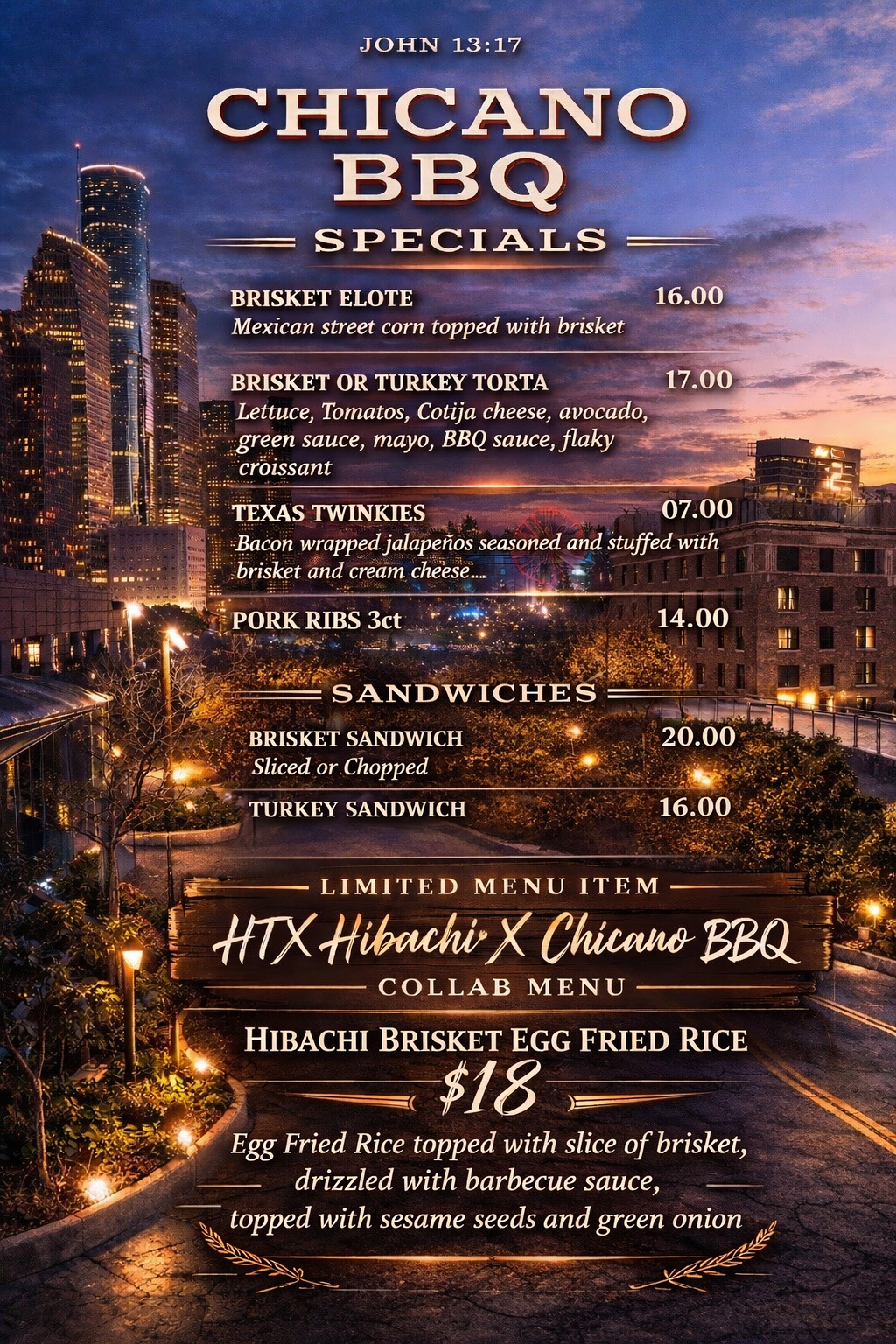 Chicano BBQ is coming to POST Houston's Rooftop Rodeo Kickoff! Check out the menu and arrive hungry, they're open for service until the brisket's all gone!