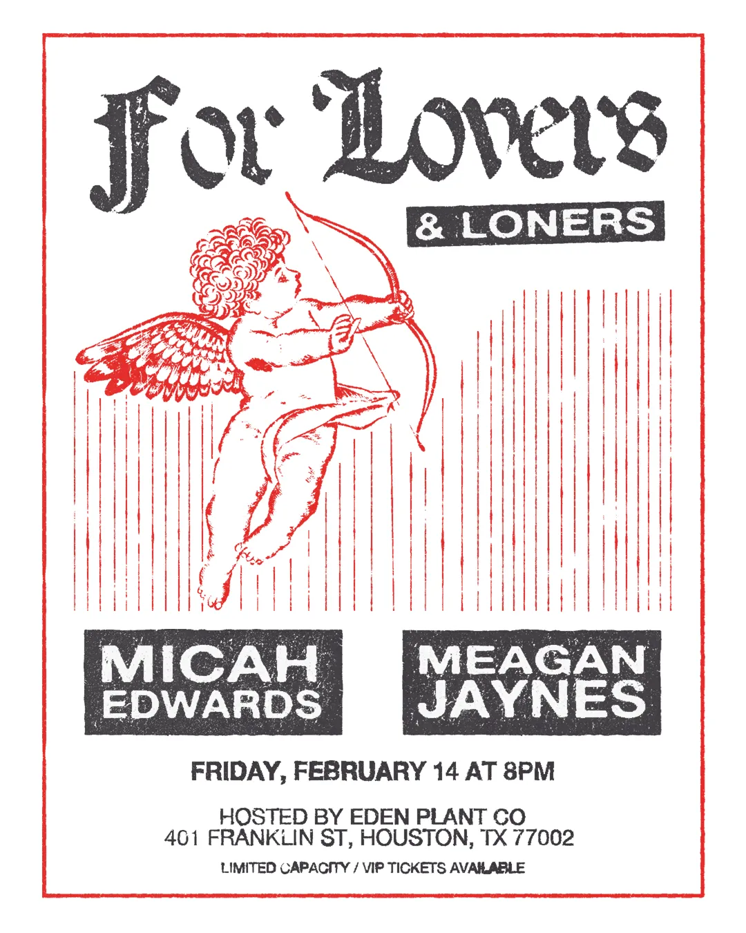 Celebrate Valentine’s Day with a night of soulful vibes at For Lovers & Loners - an evening that’s perfect for couples, singles, and everyone in between. Join hosts Micah Edwards and Meagan Jaynes for soulful performances that set the perfect mood, followed by a lively round of musical bingo at Eden Plant Co., where you can win exciting prizes!